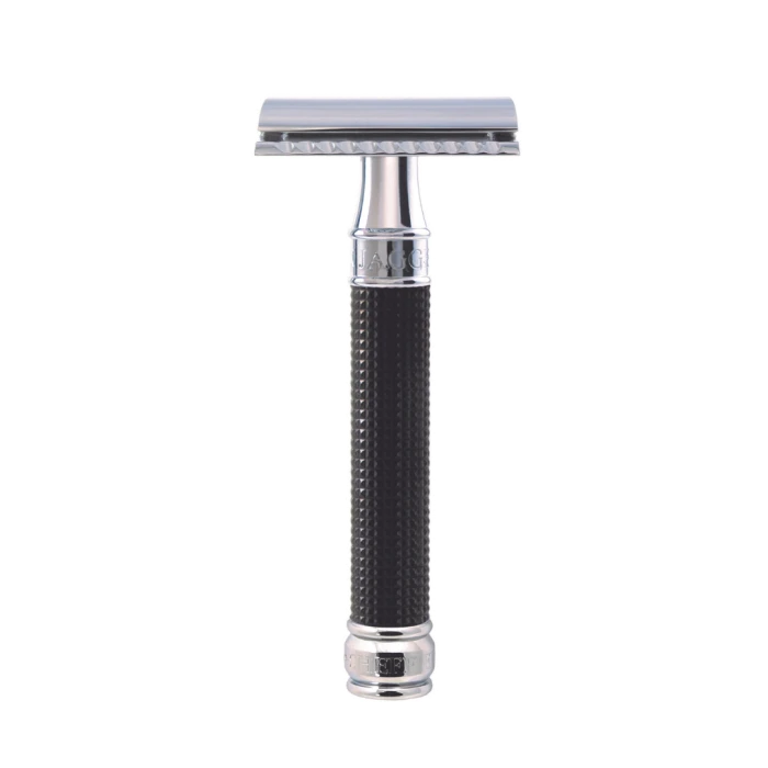 Machined from solid brass, triple-plated and hand-polished, this razor has a unique and attractive 3D black metallic design. The attractive textured diamond handle offers superb grip, proving particularly useful when shaving with damp or soapy hands. Not only is this design safe and practical, the black finish also gives the razor a particularly eye-catching aesthetic.
