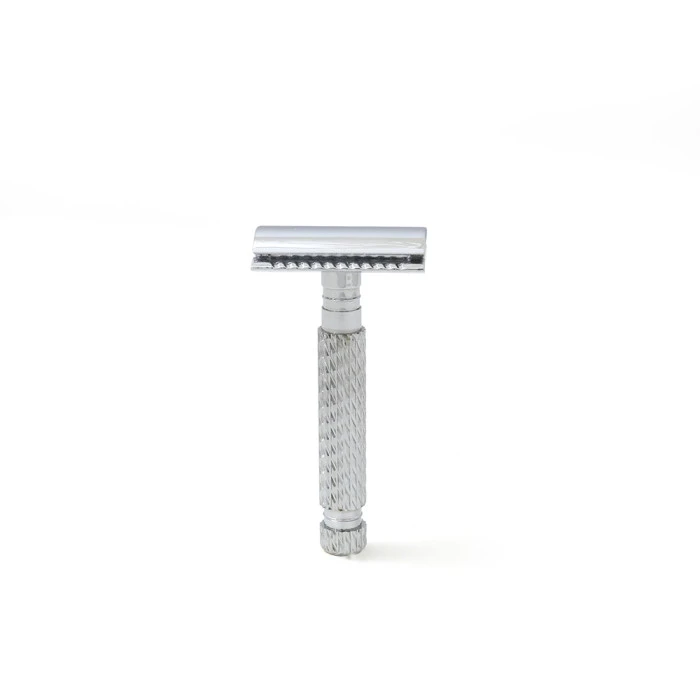 The razor is crafted from nickel plated brass for durability. The detailed diamond engraved handle design gives the razor an aesthetically pleasing appearance and enhanced wet grip. The pattern extends down right to the bottom of the razor, leaving no part of the handle smooth and therefore at risk of becoming slippery.