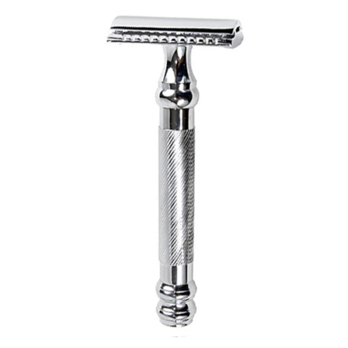 The razor is crafted from chrome plated brass for durability. The attractive handle design features a barber pole style engraved pattern, giving the razor an aesthetically pleasing appearance and enhanced wet grip. The longer handle design (approximately 108mm) allows for greater control when shaving harder to reach areas.